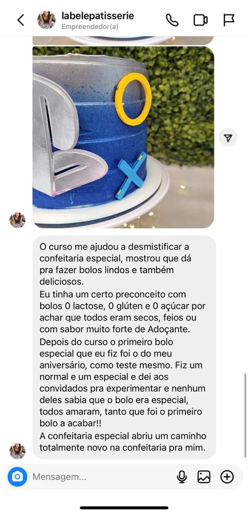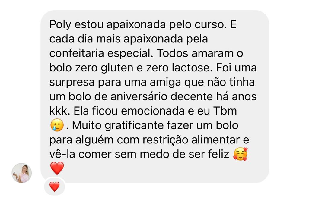 Os cursos CONFEITARIA ESPECIAL 2.0 e o Sobremesas Especiais são onde você vai aprender todos os segredos para fazer bolos e doces deliciosos, dominando as técnicas da confeitaria inclusiva e tradicional para surpreender a todos com bolos e doces sem glúten, sem lactose e sem açúcar sem precisar abrir mão da confeitaria tradicional! Além disso, você tem a chance de se tornar um especialista dessa área tão pouco explorada pelas confeiteiras com muito conteúdo teórico, prático e muitas aulas bônus para ajudar você a alavancar o seu negócio.