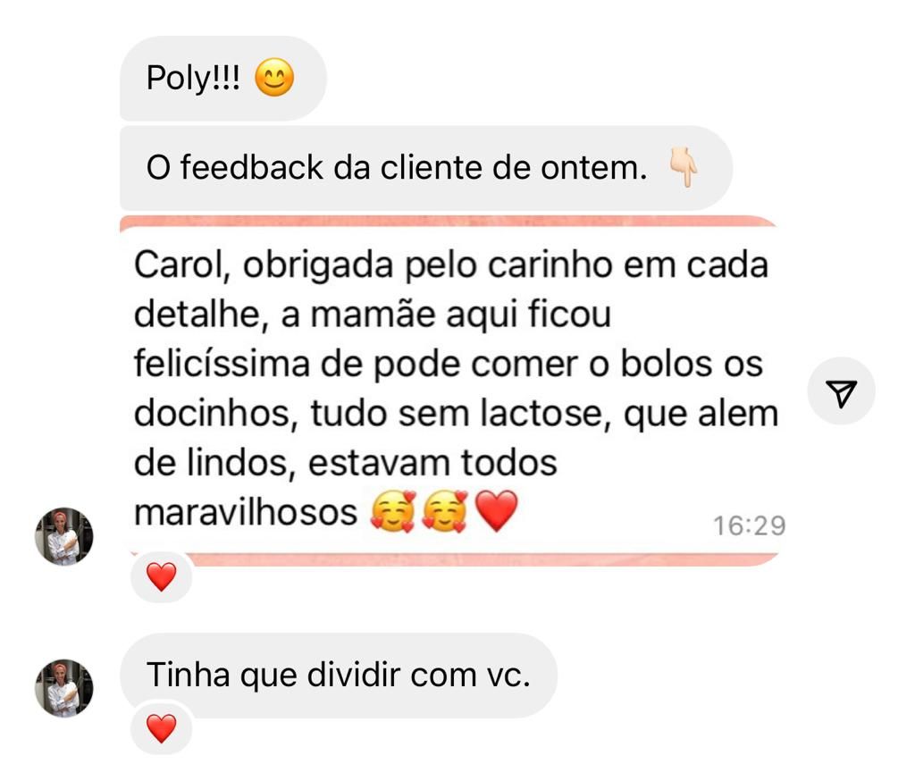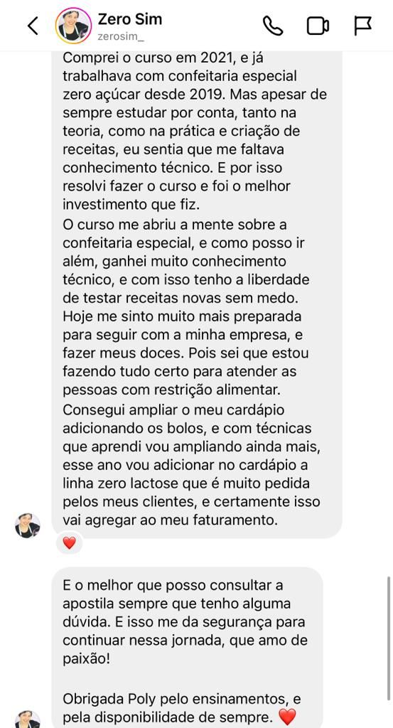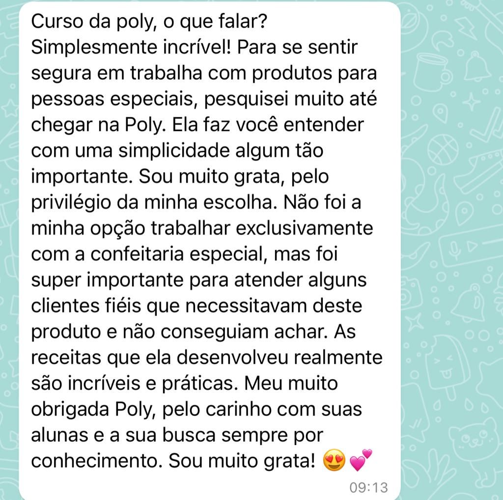 Nesse curso você terá acesso a todas as receitas da Poly a vai aprender a transformá-las em especiais: diet, sem glúten e sem lactose! É um curso 2 em 1, pois além de você aprender todas as receitas na versão tradicional e todo o conteúdo base da confeitaria tradicional, você aprende toda a teoria de como substituir não só as receitas do curso para cada restrição, você também aprende como fazer as substituições nas suas receitas! E nessa BLACK, além de ter o acesso vitalício desse curso, você ainda vai ter acesso vitalício ao curso de SOBREMESAS ESPECIAIS! Então você vai levar um 3 em 1 incrível!